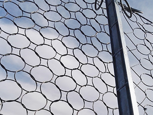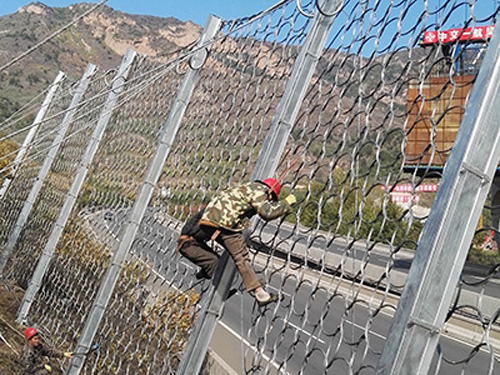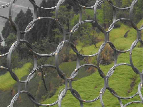 環形網由鋼絲繩網、環形網、(需攔截小塊落石時附加一層鐵絲格柵)、固定系統(錨桿、拉錨繩、基座和支撐繩)減壓環和鋼柱四個主要部分構成。鋼柱和鋼絲繩網連接組合構成一個整體,對所防護的區域形成面防護,從而阻止崩塌巖石土體的下墜,起到邊坡防護作用。